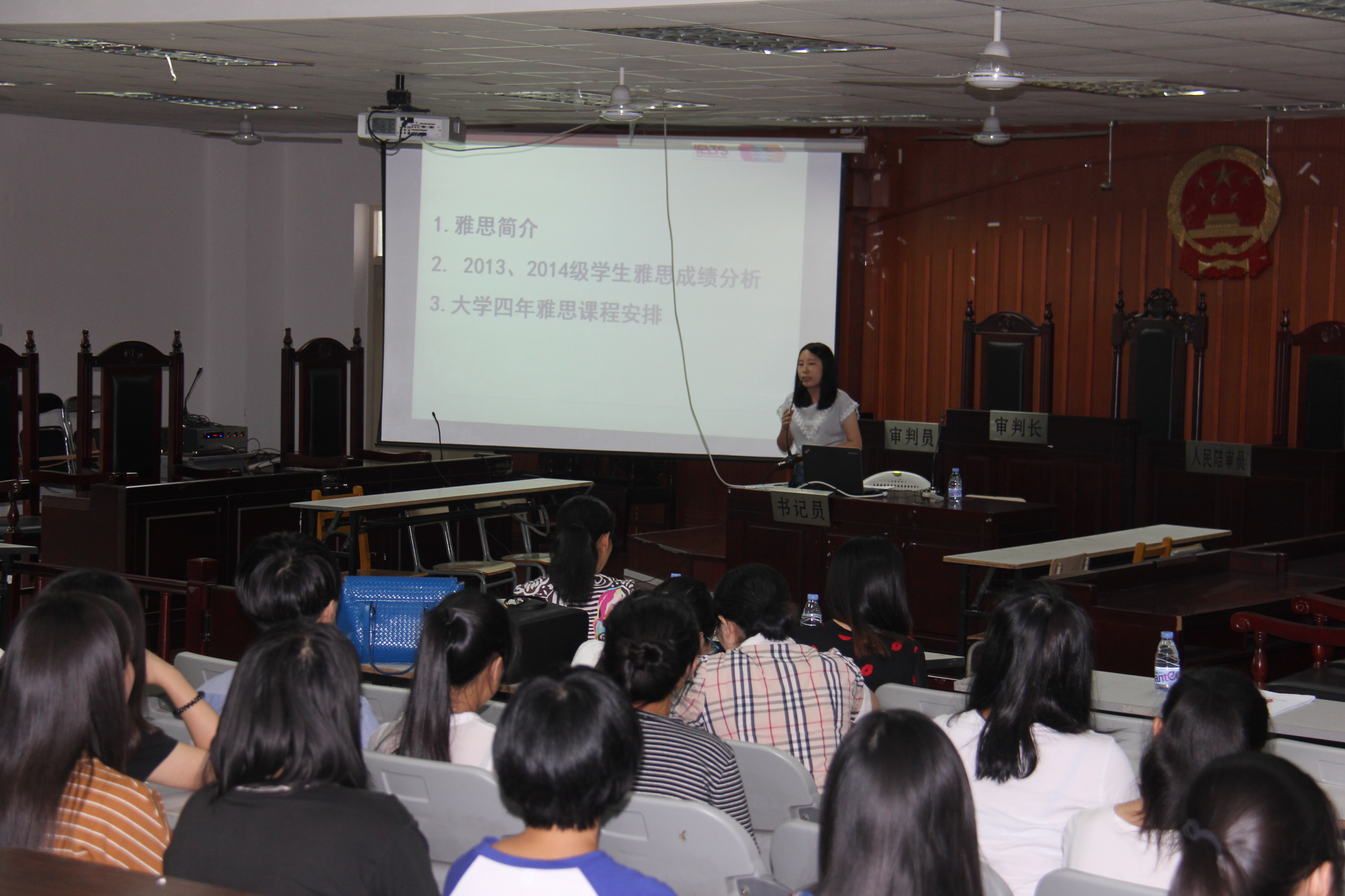 为热烈欢迎国际教育学院2015级新生,公共外语部雅思教研室的雅思教学团队和国际教育学院副书记、办公室主任、教学秘书和辅导员于2015年9月14日下午14:30一起为新生举办了雅思动员大会,希望在学院领导的关心以及雅思老师的讲解下,帮助新生明确未来学习方向。