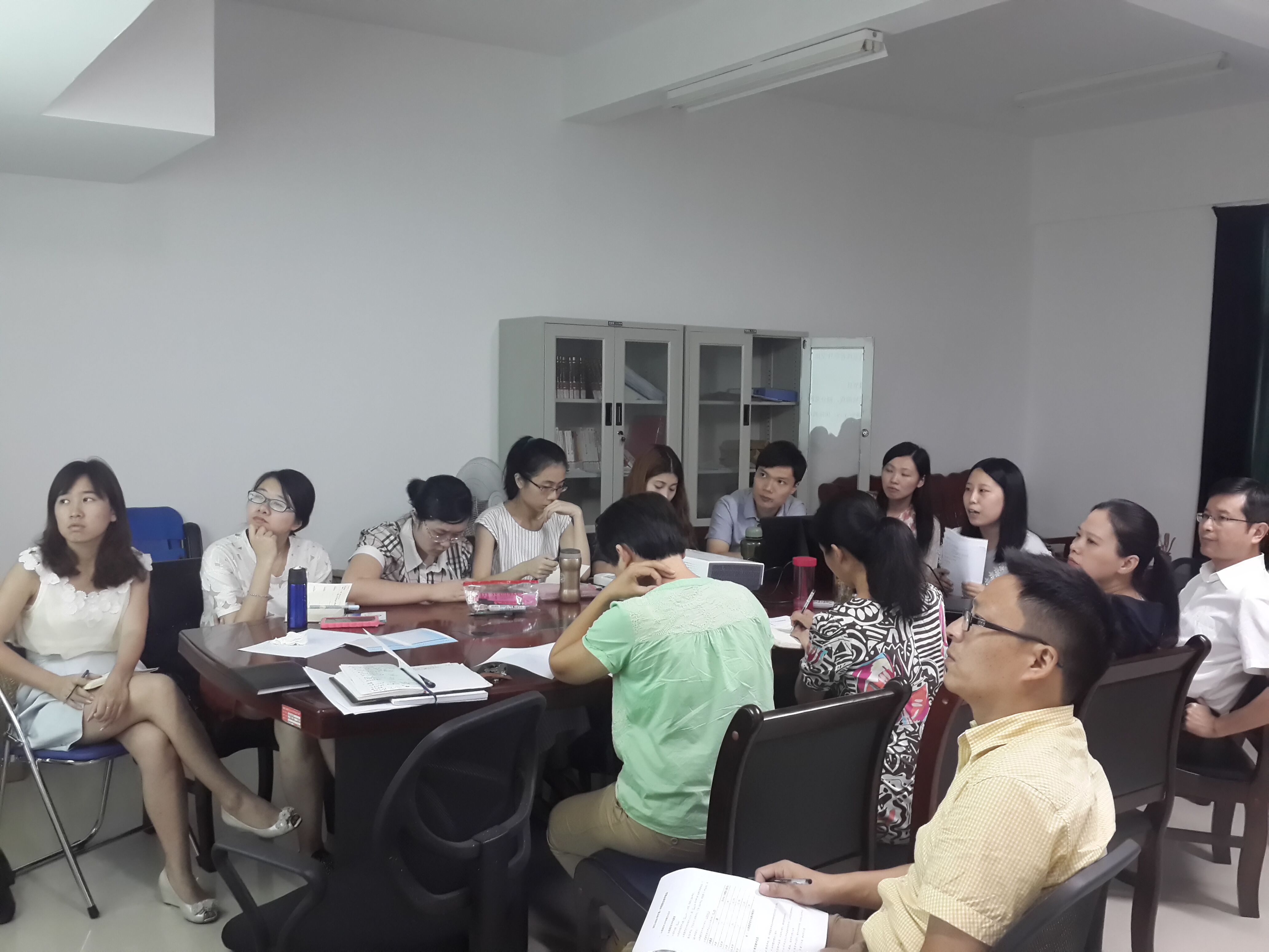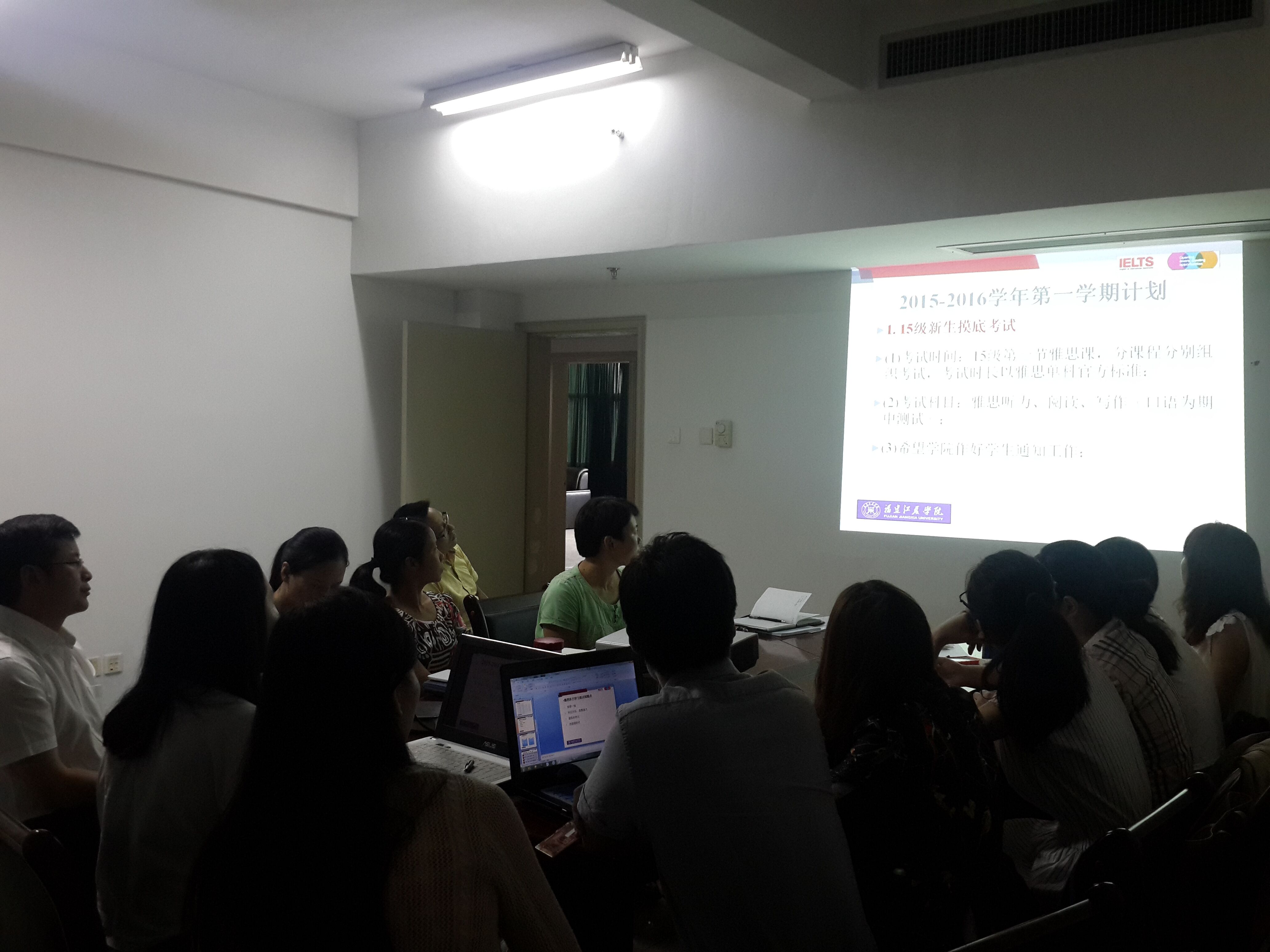2015年9月14日中午13:30,公共外语部雅思教研室组织召开2015-2016学年雅思教学工作会议,参会出席的有公共外语部郑竹群主任以及13-15级全体雅思老师,国际教育学院林建伟院长、王采采党总支副书记、SQA-HND项目协调员以及辅导员也莅临指导讨论工作。