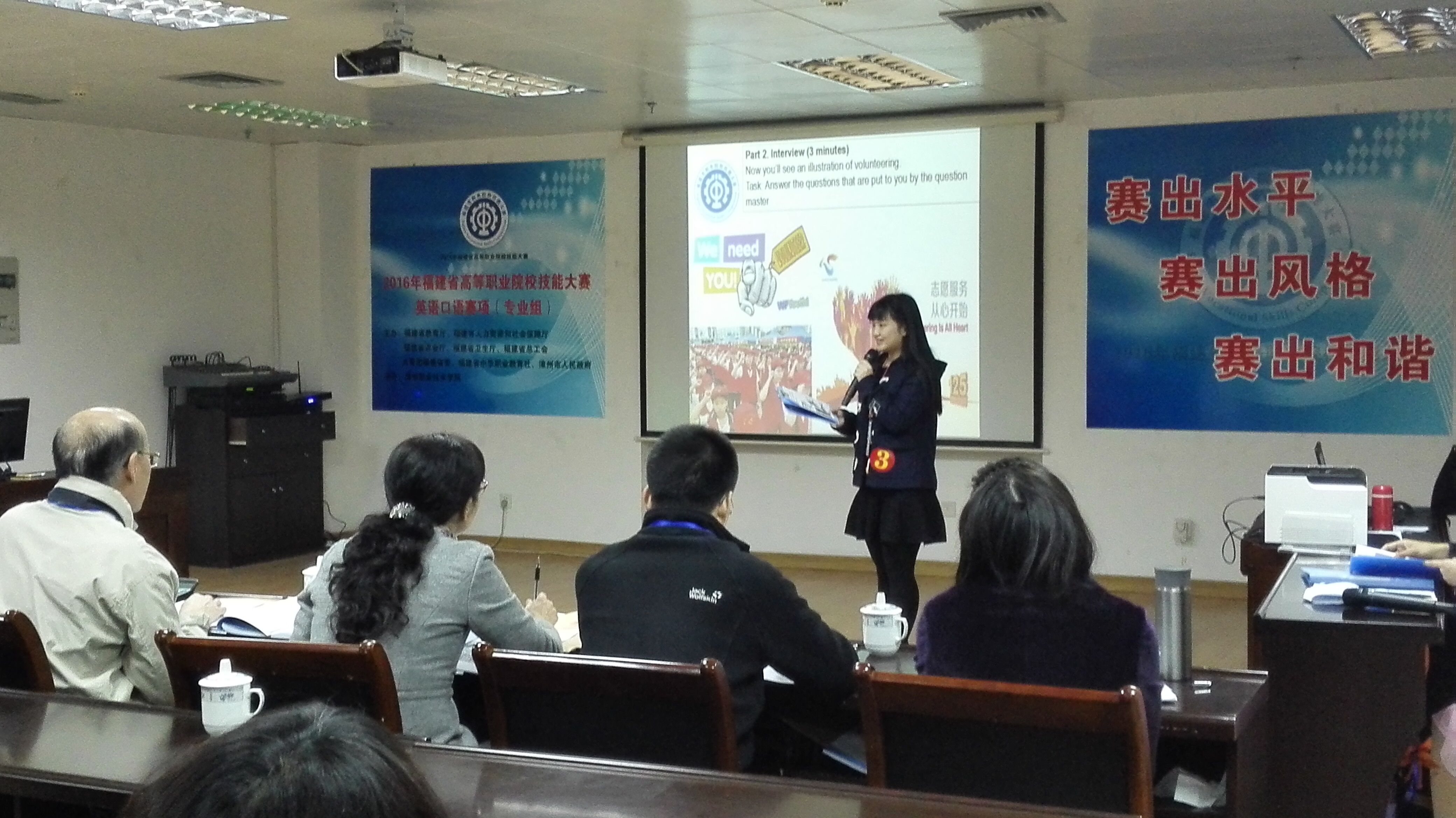 2016年福建省职业院校技能大赛英语口语项目于2015年12月26日在漳州职业技术学院举办。我校公共外语部林丽姜、马升慧老师分别指导两名学生参加本次竞赛,林丽姜老师所指导的2013级商务英语班汪冰冰同学荣获英语口语(专业组)二等奖。