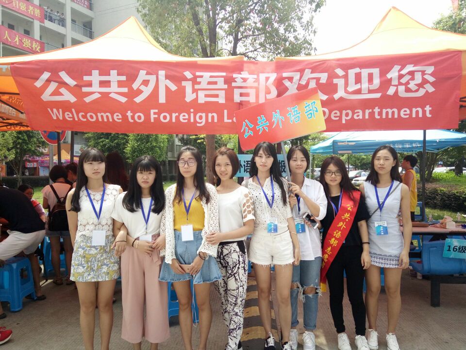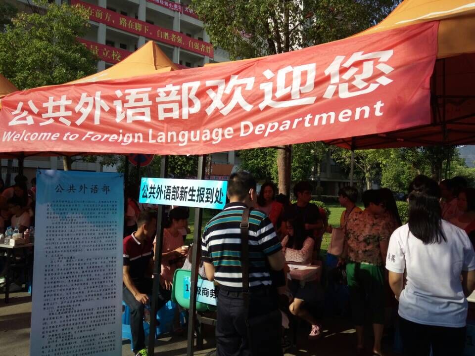 9月4日公共外语部迎接16级新生活动在生活区开展。这是公共外语部第一次招生,通过多方筹集力量,各项迎新活动有条不紊地进行。