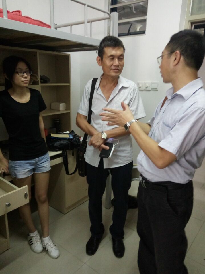 从早上7点起,辅导员和学生干部布置报到点、准备给新生的材料、再次细化分工,有的负责引导带路、有的负责接待答疑、有的负责搬运行李。迎新期间校领导来到活动现场慰问工作人员,并询问了迎新工作的开展情况,与新生家长进行交流,鼓励新生在大学里认真学习,充实自己。公共外语部党总支书记宋志强到场参加迎新工作并和辅导员老师一起到学生宿舍看望学生,与学生交流了解情况。