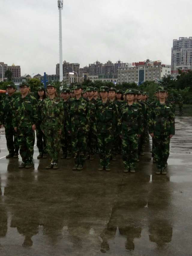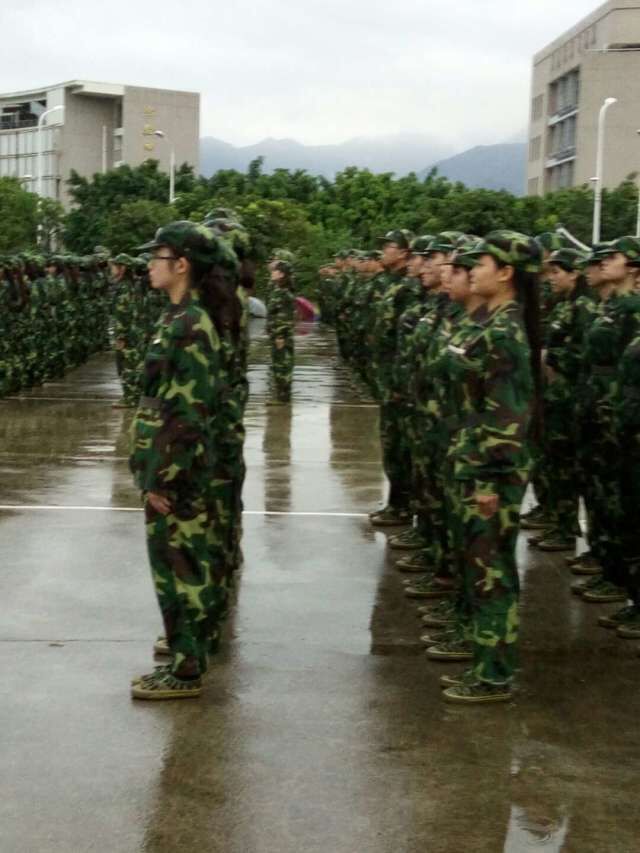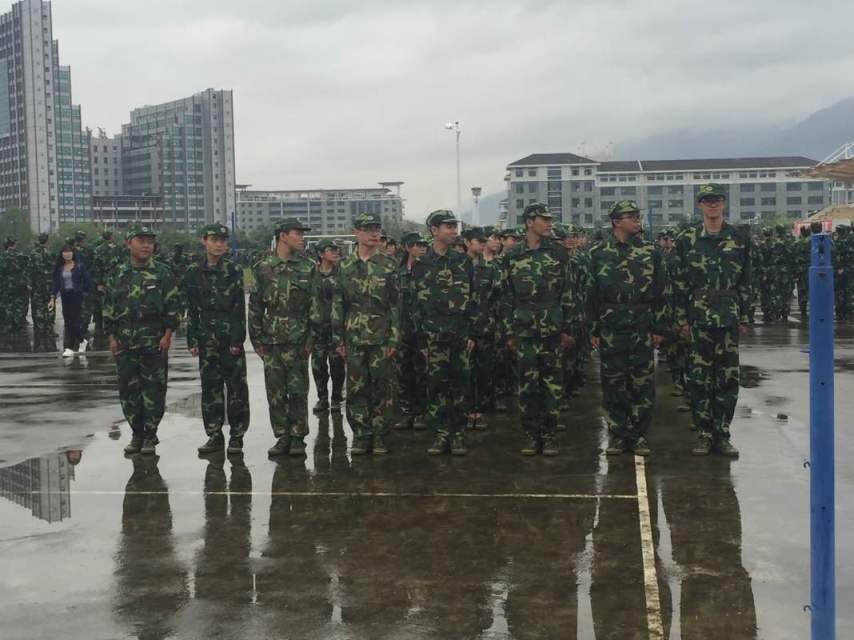 10月9日上午,在田径场上,公共外语部的新生们正在接受为期8天的军训。近来受台风天气及冷空气影响,天气阴冷伴有小雨。而新生们却军姿不改,在教官的指挥下顶着风雨继续军训。军训期间,公共外语部主任郑竹群老师、党总支书记宋志强老师、辅导员何万莉老师及助导们时不时在一旁为新生们加油打气。