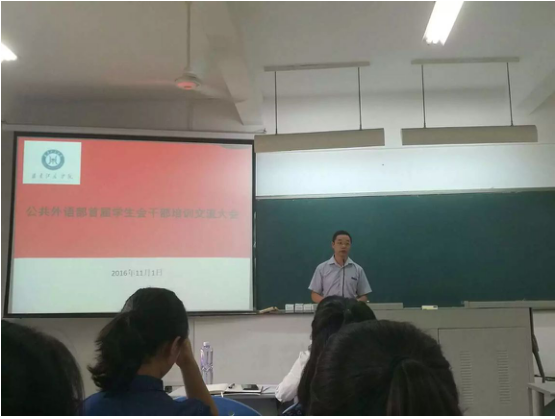 2016年11月1日14:30在4号楼202教室召开了公共外语部首届学生会干部交流大会。本次大会的与会人员有公共外语部党总支宋志强书记和辅导员何万莉老师,学生会主席团成员、各部门主要负责人及干事。