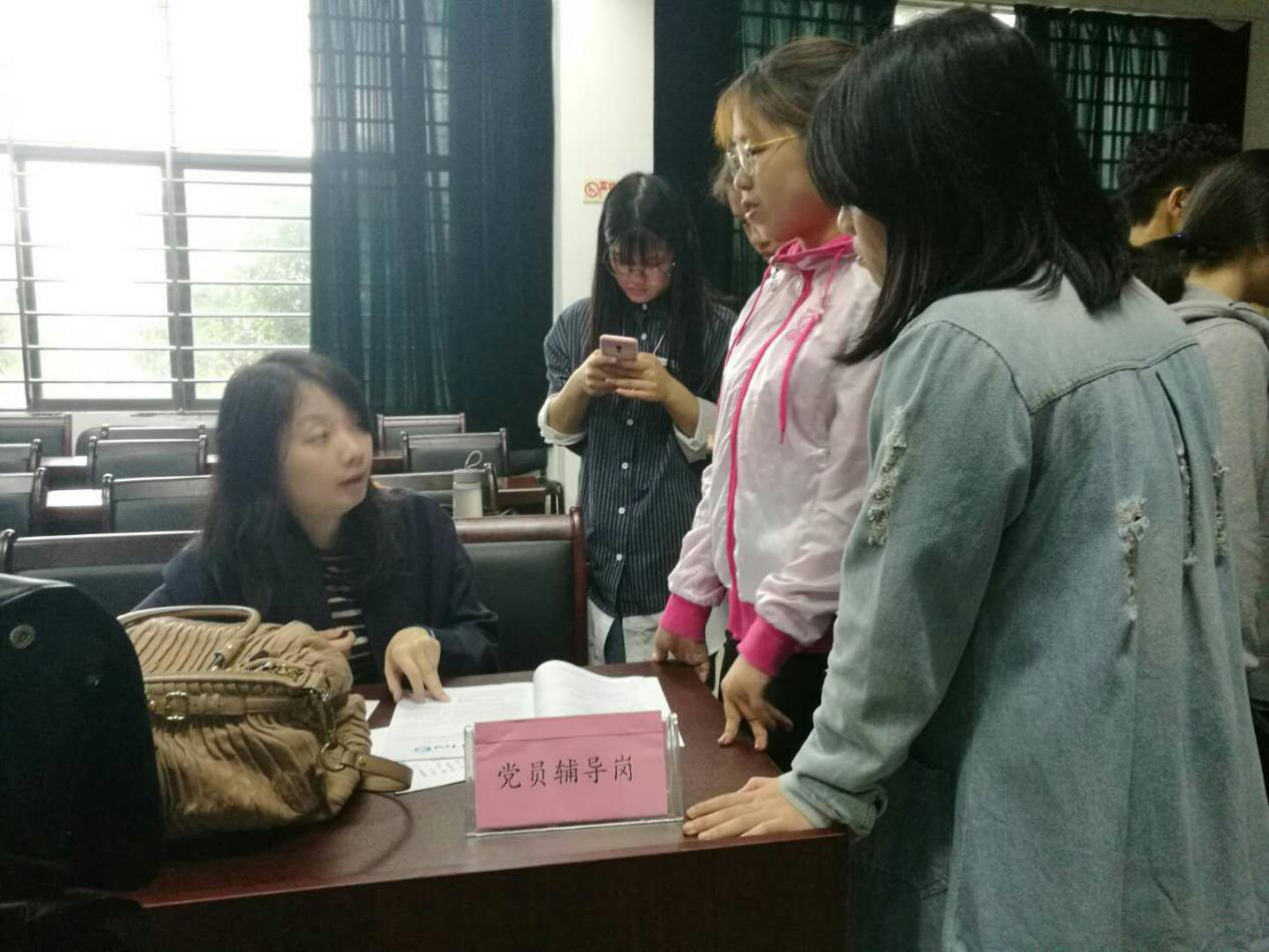 (图为党员教师正在教研室为前来咨询的同学做解答)