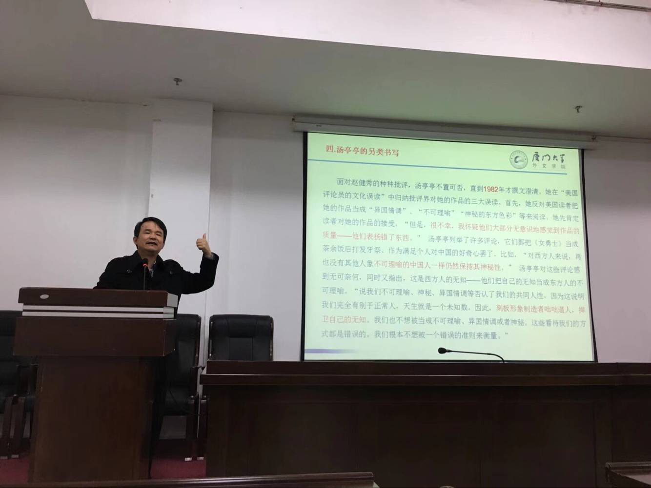 2017年12月28日下午,开云足球邀请厦门大学外文学院张龙海教授为全院教师开展题为《美国华裔作家的焦虑和误读——以汤亭亭为例》的龙江讲坛活动。讲座中,张教授运用美国批评家哈罗德·布鲁姆的诗学影响理论分析美国华裔作家汤亭亭的焦虑和误读。汤亭亭在《女勇士》中创造性地改写中国文化元素,塑造出美国花木兰形象,从而完成另类神话的书写。