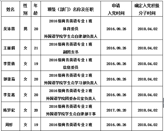 经福建江夏学院开云足球教工第三党支部召开党员大会研究,确定下列入党申请人为入党积极分子。现根据相关规定,将入党积极分子名单公示如下: