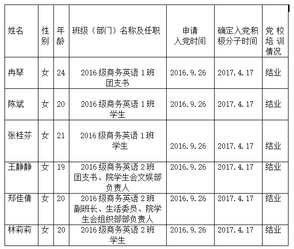 经福建江夏学院开云足球教工第三党支部培养考察,支部大会研究认为下列同志基本符合党员条件,拟列为2018年上半年度党员发展对象,近期将组织人员对他们进行政治审查。现将名单公示如下: