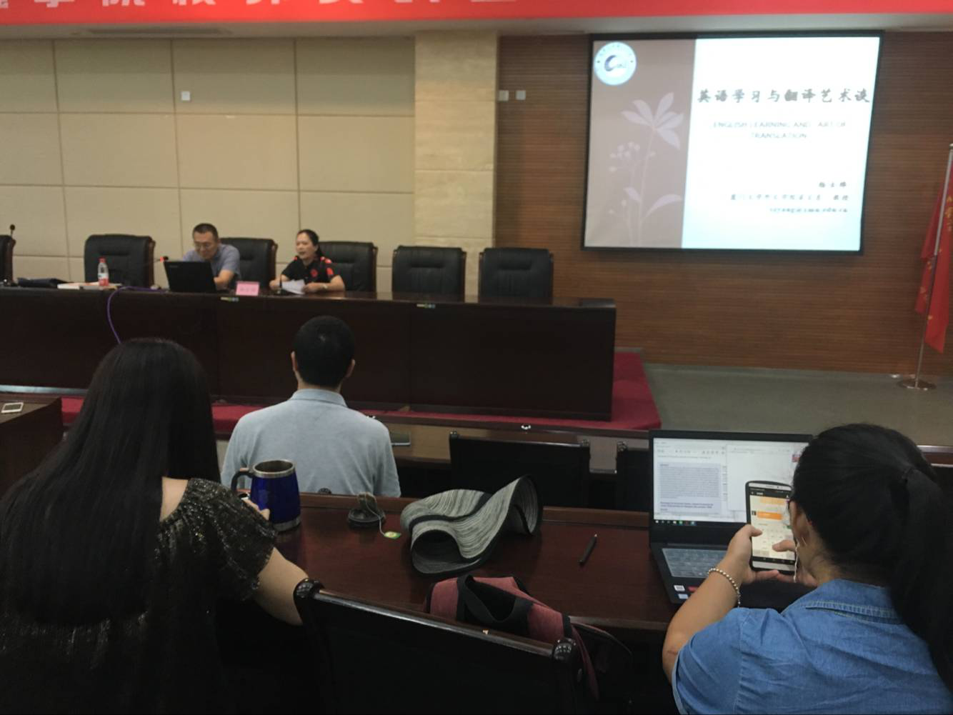 2018年6月11日下午,厦门大学外文学院英语系主任杨士焯教授莅临我校龙江讲坛,做题为“英语学习与翻译艺术谈”讲座。杨教授从自身数十年的翻译经验出发探讨翻译的定义、翻译的困难、翻译的技巧、翻译的乐趣、翻译的教学等。用丰富而有趣的例证展示翻译的艺术魅力,并告诫从事翻译学习应注意对文本的考证,应以严谨认真的态度对待翻译。