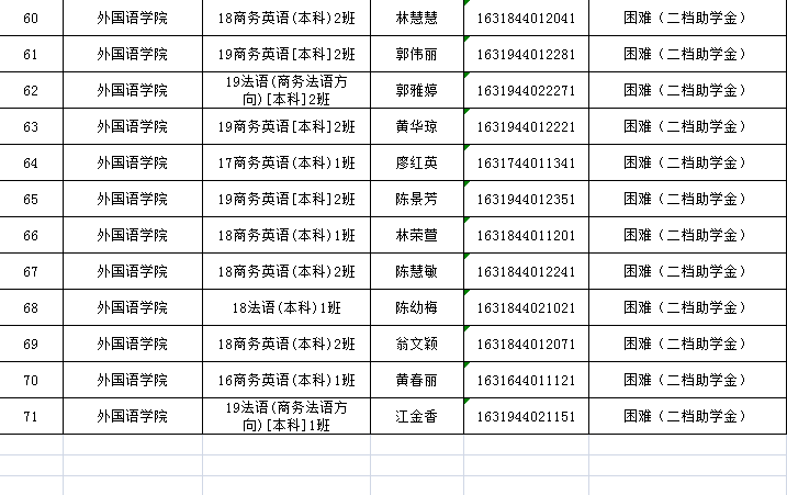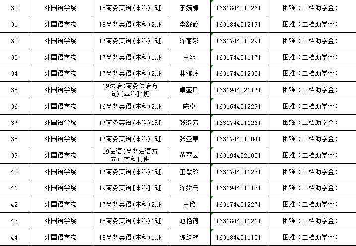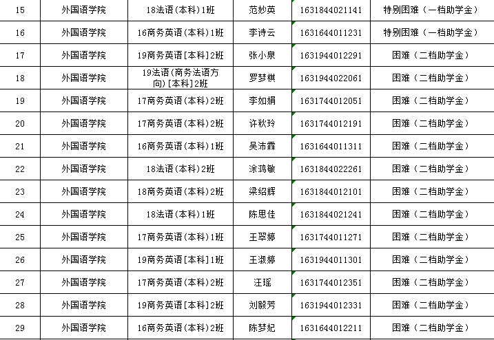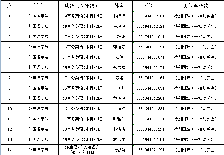 根据财政部 教育部 人力资源社会保障部 退役军人部 中央军委国防动员部开云足球印发《学生资助资金管理办法》的通知(财科教[2019]19号)、《福建省教育厅等四部门开云足球调整职业院校奖助学金政策的通知》(闽教学〔2019〕23号)、《福建江夏学院国家助学金实施办法》和《开云足球进一步做好2020年春季学期学生资助工作的通知》(闽教助中心〔2020〕7号)等文件精神,按照我校《开云足球做好2019-2020学年第二学期国家助学金工作的通知》的精神,经学生本人申请和开云足球审核,现将拟获得国家助学金学生名单予以公示。公示时间:2020年5月18日至5月20日,共3个工作日。如有异议,请到学院C115办公室 反映问题,电话:15359762532。