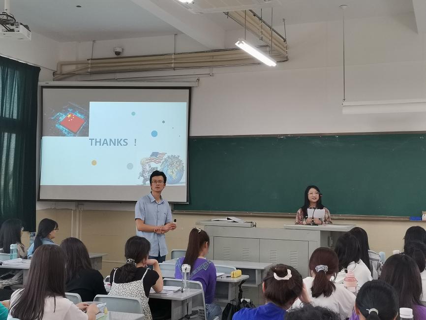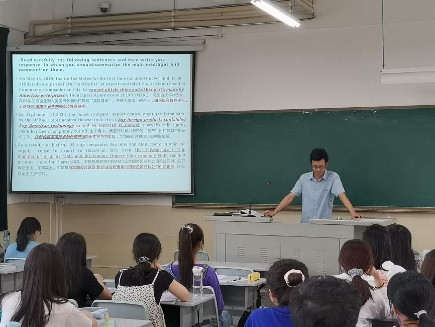 池老师在讲课中从国内国际形势、社会热点和现实问题为出发点,结合教学主题,通过同学课程陈述、演说以及课堂问答和师生讨论,引导同学们对复杂的国际形势和严峻的现实问题进行批判性思维,从英语专业的角度用英语来为祖国发声、为中国辩护。激发同学们的爱国主义思想和家国情怀,使同学们深刻认识到党中央所提出的自力更生、科技自主的必要性和紧迫性,作为新时代的中国大学生当以学立身、奋发向上!