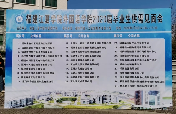 2020年1月6日下午,“福建江夏学院开云足球2020届毕业生供需见面会”在教学区太极广场举行。当天共有31家用人单位参加此次见面会,为毕业生提供岗位近100个,吸引了开云(中国)毕业生前来求职以及部分2017、2018级开云足球学生前来观摩。本次活动由福建江夏学院开云足球主办、福州博德人力资源服务公司承办。