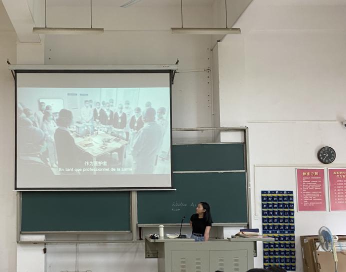 课程中,阮老师从教材课文入手,以一位职业医生在听诊中遇到困难并设法创新性解决困难的事迹为例,与学生探讨医生的敬业精神以及成为一名优秀医生所具备的品质,然后她进一步引申到在今年抗击新冠肺炎中逆流而行、舍生忘死的中国医生以及他们身上所体现的敬业、奉献、爱国的精神品质。