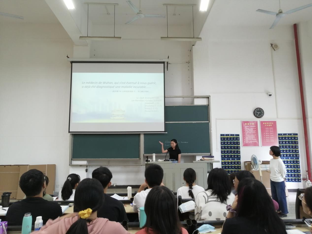 其次,紧密结合职业理想和职业道德教育,弘扬社会主义核心价值观。在《基础法语(3)》的课上,阮滢瑛老师从一篇涉及医生职业道德的课文讲到在新冠肺炎中舍生忘死、逆流而上的中国医护人员,激发学生的民族自豪感和爱国精神。在《综合商务英语(3)》的课上,池舒文老师从一篇涉及科技的课文谈到了西方国家对我国如“华为”这类的高科技企业的经济封锁,引导学生认识到党中央所提出的自立更生、科技自主的必要性和紧迫性。