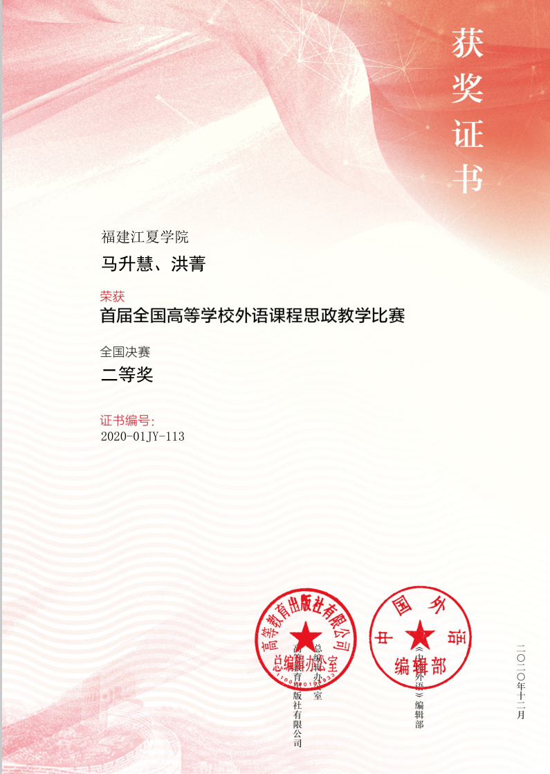 1222日,2020年“首届全国高等学校外语课程思政教学比赛”全国决赛获奖名单公布,开云(中国)郑璐杰、宋立林、尤佳湄、吴可佳团队和马升慧、洪菁团队通过层层选拔和激烈角逐,分别获得本科大学英语组全国决赛二等奖和本科英语类专业组全国决赛二等奖。