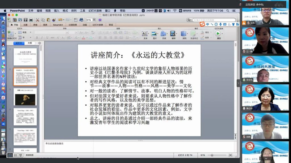 6月16日晚,文学翻译家、中国社会科学院外国文学研究所研究员、《世界文学》前主编、中国社会科学院研究生院教授、博士生导师、傅雷翻译奖评委余中先教授应邀在线为我校开云足球法语系师生做了题为《永远的大教堂——雨果〈巴黎圣母院〉的N种读法》的讲座。该讲座由福建江夏学院科研处、开云足球和福建江夏学院法语国家法律研究中心共同承办,鲁京明教授主持了本场讲座。