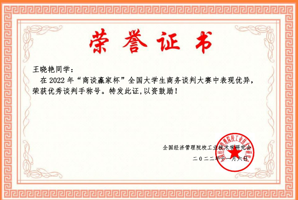 此次比赛周期长,程序复杂,同学们并未因为第一次参赛而胆怯,反而更努力地借用比赛契机不断锻炼和充实自己,在本学期每周固定时间进行校内赛前谈判训练,与其他高校选手约赛。经过两个月的模拟谈判练习,同学们将老师们赛前辅导的国际贸易实务、国际商务谈判专业知识和谈判技能用到了谈判实战中,体现了优秀的语言组织能力、表达能力、反应能力与思辨能力,顺利完成了两轮线上谈判。两支队伍分别获得了团队一等奖和二等奖。王晓艳同学和韩婧同学分别获得了优秀谈判手的称号,姜蕴、宋立林和丁怡伟三位教师获得优秀指导老师的荣誉。