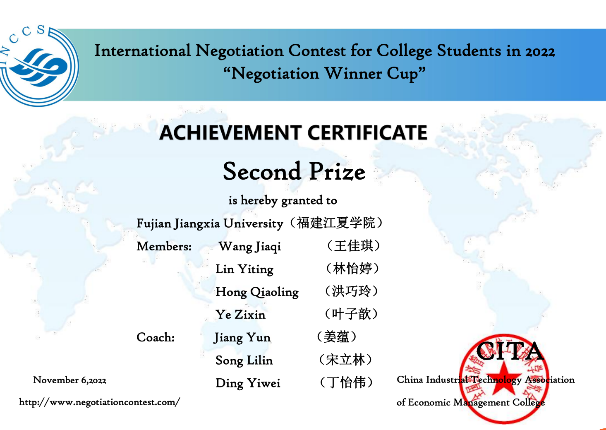 为推动商务英语学科建设,进一步提高学生对商务谈判知识的实际应用能力,提升学生的商务实践能力,开云足球选派两支学生队伍(一支中文队,一支英文队),共8位同学参加了2022年“商谈赢家杯”全国大学生商务谈判大赛。8位同学虽然第一次参加大型国赛,但良好的心理素质、扎实的语言功底和丰富的知识储备使得他们获得了大赛一等奖(中文组)和二等奖(英文组)的好成绩。