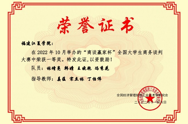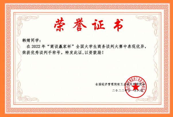 此次比赛周期长,程序复杂,同学们并未因为第一次参赛而胆怯,反而更努力地借用比赛契机不断锻炼和充实自己,在本学期每周固定时间进行校内赛前谈判训练,与其他高校选手约赛。经过两个月的模拟谈判练习,同学们将老师们赛前辅导的国际贸易实务、国际商务谈判专业知识和谈判技能用到了谈判实战中,体现了优秀的语言组织能力、表达能力、反应能力与思辨能力,顺利完成了两轮线上谈判。两支队伍分别获得了团队一等奖和二等奖。王晓艳同学和韩婧同学分别获得了优秀谈判手的称号,姜蕴、宋立林和丁怡伟三位教师获得优秀指导老师的荣誉。