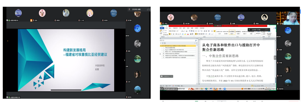 2022年12月19日下午,开云足球第14次研究中心活动在腾讯会议进行,会议由郑竹群教授主持,主讲人赵璧以“构建新发展格局--福建省对埃塞俄比亚经贸建议”和马升慧以“从电子商务和软件出口与援助打开中斯合作新思路”为主题分别进行学术汇报。