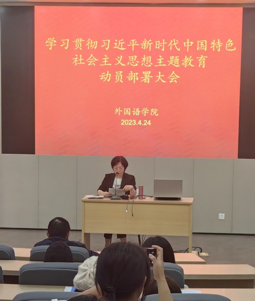 4月24日,外国语学院在图书馆北报告厅召开学习贯彻习近平新时代中国特色社会主义思想主题教育动员部署大会,深入学习贯彻习近平总书记在中央主题教育工作会议上的重要讲话精神,按照党中央决策部署和上级党委工作安排,对学院主题教育工作进行动员部署。学院全体师生党员和入党积极分子参加,党委叶晓玲书记作动员讲话。