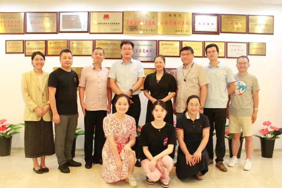 郑竹群院长、张永蓬教授、池舒文主任、赖荣发主任、丁怡伟主任与中心领导在挂有“福建江夏学院开云足球实习实训基”牌匾墙前合影。