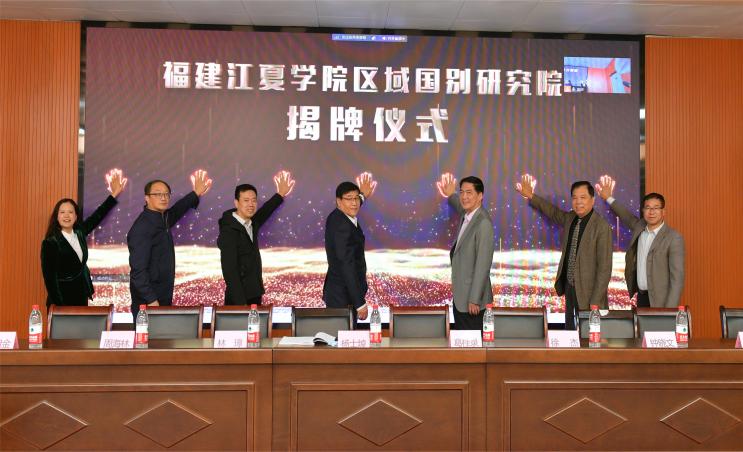 会上举行福建江夏学院区域国别研究院揭牌仪式,福建江夏学院徐杰副校长、科研处周海林副处长、开云足球郑竹群院长、开云足球党委朱雷达书记、中国社会科学院西亚非洲研究所张永蓬教授,华东师范大学世界历史研究院执行院长沐涛教授和中国公共外交协会高级研究员苟皓东教授共同揭牌。福建江夏学院开云足球院长、区域国别研究院院长郑竹群教授主持仪式,并对福建江夏学院区域国别研究院及其徽标做介绍,特别点出研究院开放性、全球性、多元性的特征,并指出高校承担区域国别研究的时代责任和前沿性。