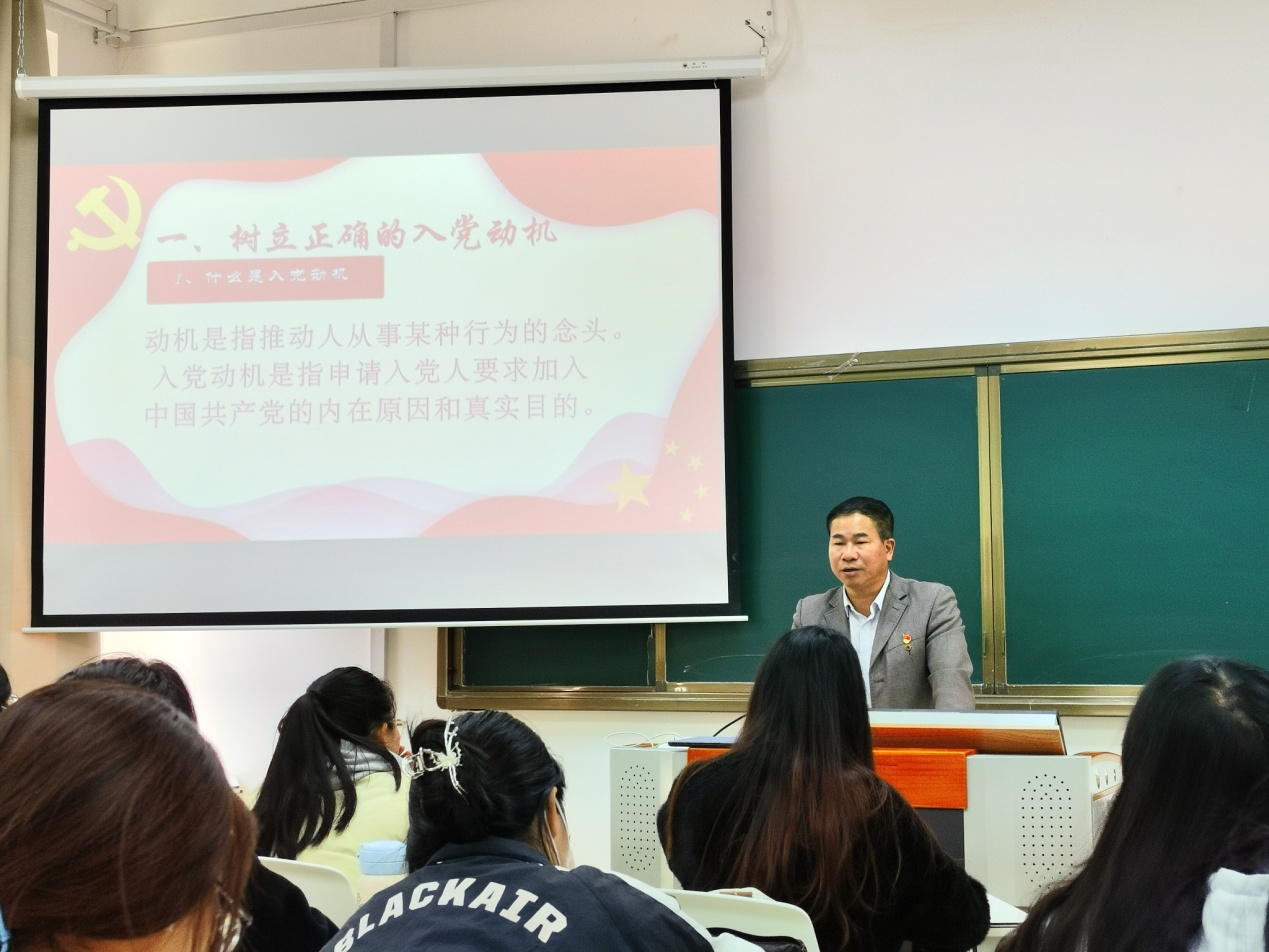 之后,朱雷达为入党积极分子、发展对象讲授《端正入党动机 争做合格党员》党课。朱雷达通过举例分析大学生中存在不正确入党动机的类型和表现,与在场学生深入讨论应如何端正入党动机,强调树立正确的入党动机是争取入党的首要问题。树立入党动机就是要树立正确的目标即共产主义的理想,要坚定为实现共产主义理想而奋斗的意志,即坚定共产主义信念。最后,朱雷达要求同学们要用党员标准严格要求自己,以实际行动争取入党,做到学习理论、坚定信念,牢记宗旨、勇挑重担,艰苦朴素、勤奋好学,严以律已、争做模范。