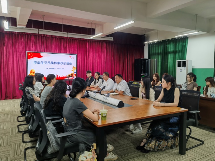 学院党委副书记、纪检委员陈松与在场毕业生党员开展集体廉洁谈话。他指出对于大部分同学而言,走出校门就意味着步入社会,可能会面对各类诱惑和层层挫折,青年党员同志们既要坚守本心,又要努力奋斗;既要自律自省,又要勇于创新;既要怀抱梦想,又要脚踏实地。将“廉洁”不止于心,更践于行。