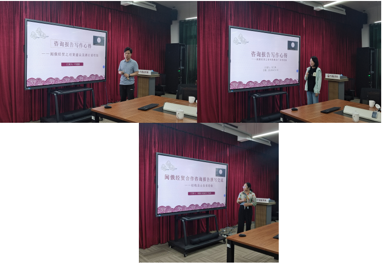 617日,丁怡伟就“咨询报告写作心得 ——闽俄经贸之写作结构及山东省经验,宋立林就“咨询报告写作心得 ——闽俄经贸之资料收集及广东省经验,叶逢源就“咨询报告写作心得 ——闽俄经贸之对策建议及浙江省经验进行学术汇报。