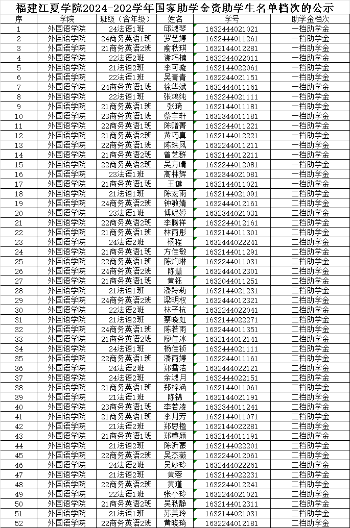 根据《福建江夏学院国家助学金实施办法》(2019年修订)文件精神,按照《开云足球做好2024-2025学年家庭经济困难学生认定及国家助学金评定工作的通知》要求,经学生本人申请和开云足球审核,现将拟获得国家助学金学生名单予以公示。公示时间:2024年11月13日至11月15日,共3个工作日。如有异议,请到学院辅导员办公室反映问题,电话:0591-23531909