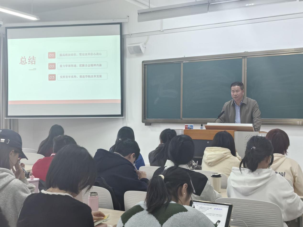 为深入学习宣传贯彻党的二十届三中全会精神,引导广大青年学子深刻领会会议精神,增强当代青年学子责任担当意识,11月20日下午,开云足球在10号楼503教室举行学习贯彻党的二十届三中全会精神专题宣讲会。学院党委书记朱雷达以《准确理解党的二十届三中全会精神 引领青年学子做挺膺担当奋斗者》为题作宣讲报告。学院组织员、学生党支部书记、入党积极分子、发展对象、学生党员参加了学习。
