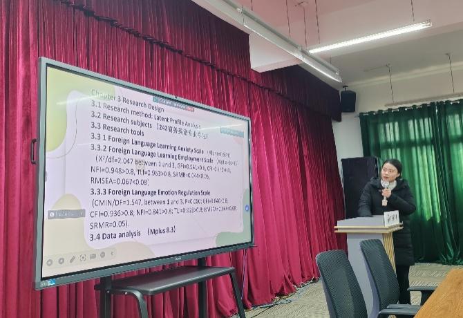 研讨会上,马升慧就“商务英语专业学生外语情绪调节策略及其对外语情绪影响研究”,张雅楠(线上)就“费氏三维分析模型视角下法国总统马克龙身份构建分析——以马克龙第二个任期就职典礼演讲为例”进行学术汇报。