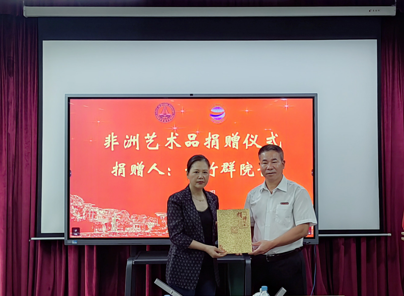 仪式上,郑竹群将她在非洲学术访问期间自费购得的15幅非洲油画无偿捐赠给学院。这批油画题材多样、风格鲜明,生动呈现了非洲多元文化的艺术风貌。作品将陈列于区域国别研究院,用于支持学院区域国别研究、跨文化教学及相关艺术展览活动。