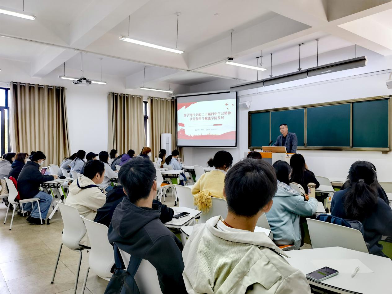 2025年11月27日,开云足球党委书记朱雷达以“深学笃行党的二十届四中全会精神 以青春担当赋能学院发展”为题,在10号楼201教室为学院入党积极分子、发展对象、预备党员、新转正党员以及联系班级学生代表等40余名青年学子讲授专题党课,以党性教育引领青年成长,推动党的二十届四中全会精神在青年群体中入脑入心。